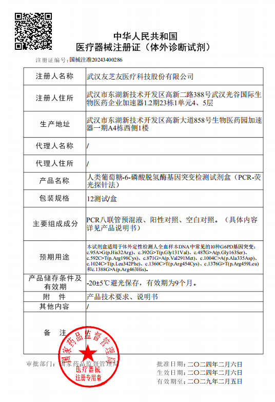 近日,武漢友芝友醫(yī)療科技股份有限公司旗下新產(chǎn)品“人類葡萄糖-6-磷酸脫氫酶基因突變檢測試劑盒(PCR-熒光探針法)”,經(jīng)國家藥品監(jiān)督管理局審批,獲得國家藥品監(jiān)督管理局(NMPA)三類醫(yī)療器械注冊證,醫(yī)療器械注冊證號:國械注準20243400286。