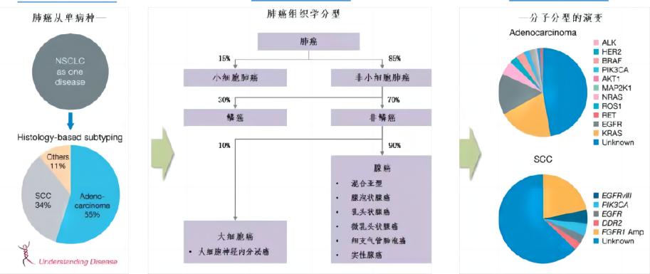 原發(fā)性支氣管肺癌簡稱肺癌,是指原發(fā)于氣管、支氣管和肺的惡性腫瘤,死亡率亦居癌癥的首位,其中非小細(xì)胞肺癌(NSCLC)占肺癌的85%以上,且多數(shù)就診時(shí)已屬進(jìn)展期。從傳統(tǒng)病理學(xué)角度,肺癌可分為鱗癌、腺癌、小細(xì)胞癌和大細(xì)胞癌幾種主要類型。在組織學(xué)分型的基礎(chǔ)上,分子診斷技術(shù)以及靶向藥物的出現(xiàn),肺腺癌可以根據(jù)相關(guān)驅(qū)動(dòng)基因突變進(jìn)一步細(xì)分成更多的亞群,進(jìn)一步明確患者的腫瘤分子分型,并實(shí)現(xiàn)精準(zhǔn)治療[2,3]。