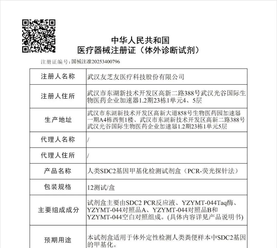 芝友醫(yī)療秉承“量體裁衣 因人施治”的使命,推出的腫瘤甲基化檢測新品——人類SDC2基因甲基化檢測試劑盒(PCR-熒光探針法),正式獲國家藥監(jiān)局三類醫(yī)療器械注冊證(國械注準20253400796),以無創(chuàng)、精準、便捷的基因檢測技術(shù),開啟腫瘤早篩新篇章!