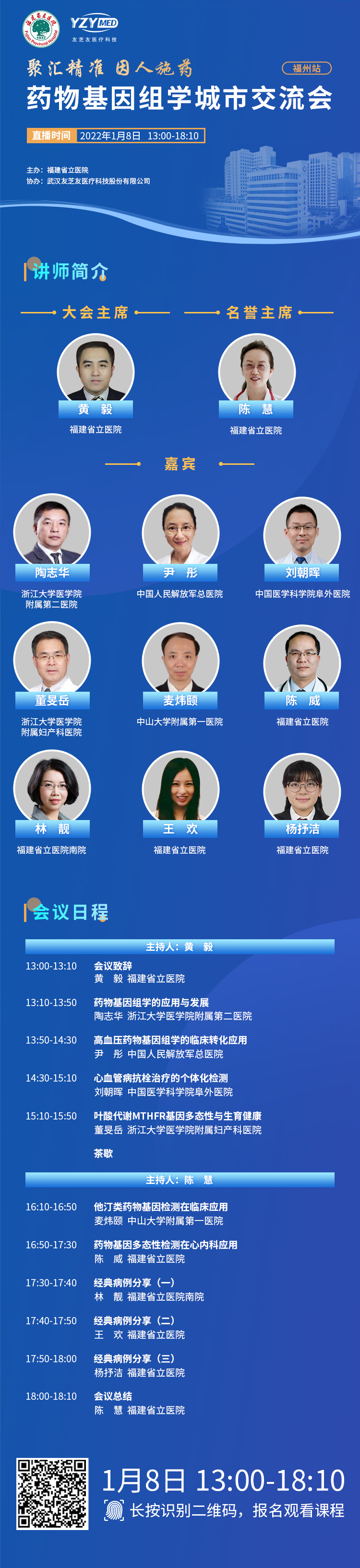 為進一步提升臨床和檢驗人員對精準醫(yī)療的認識,促進臨床研究和檢驗醫(yī)學(xué)技術(shù)的創(chuàng)新發(fā)展,由福建省立醫(yī)院主辦的“‘聚匯精準,因人施藥’藥物基因組學(xué)城市交流會”將于2022年1月8日13:00~18:10在福州世紀金源大飯店召開。本次學(xué)術(shù)大會將圍繞“藥物基因檢驗和臨床應(yīng)用領(lǐng)域最新的研究成果與未來的發(fā)展” 進行學(xué)術(shù)交流,并同步進行線上直播。屆時,我們誠摯地邀請來自臨床、醫(yī)技的各位老師和研究人員于線上觀看本次精彩的學(xué)術(shù)會議,并對藥物基因組學(xué)的臨床應(yīng)用拓展提出積極、寶貴的建議!