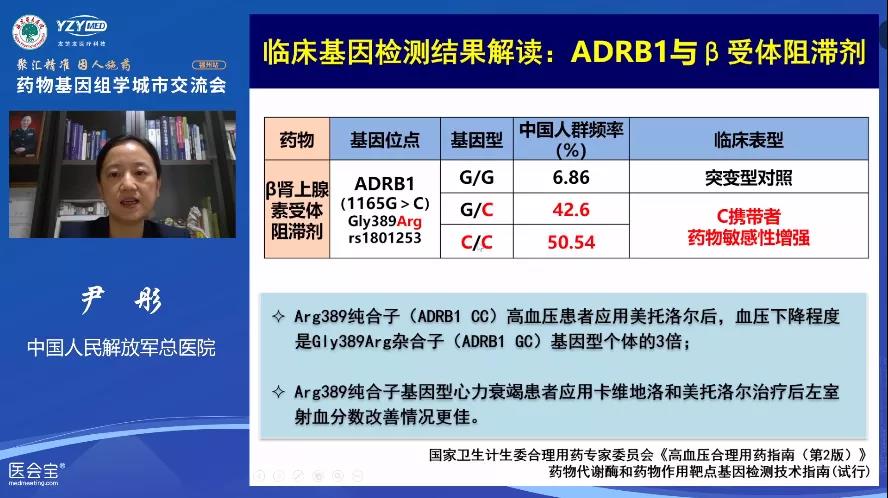 中國人民解放軍總醫(yī)院全軍老年醫(yī)學(xué)研究所的尹彤教授做了《高血壓藥物基因組學(xué)的臨床轉(zhuǎn)化應(yīng)用》的專題報(bào)告。尹教授主攻藥物基因組學(xué)在心血管疾病精準(zhǔn)醫(yī)療中的應(yīng)用,此次從基因?qū)用鎸Χ喾N降壓藥物的代謝機(jī)制及基因多態(tài)性指導(dǎo)用藥進(jìn)行了詳細(xì)說明,闡明了高血壓合理用藥的必要性以及在藥物基因組檢測方向的迫切需求。經(jīng)過尹教授的生動(dòng)演講,大家對高血壓相關(guān)基因的作用機(jī)制,以及機(jī)體對特定藥物的代謝能力不同,從而導(dǎo)致的藥物療效和毒副作用的顯著差異,有了非常清晰的認(rèn)識。