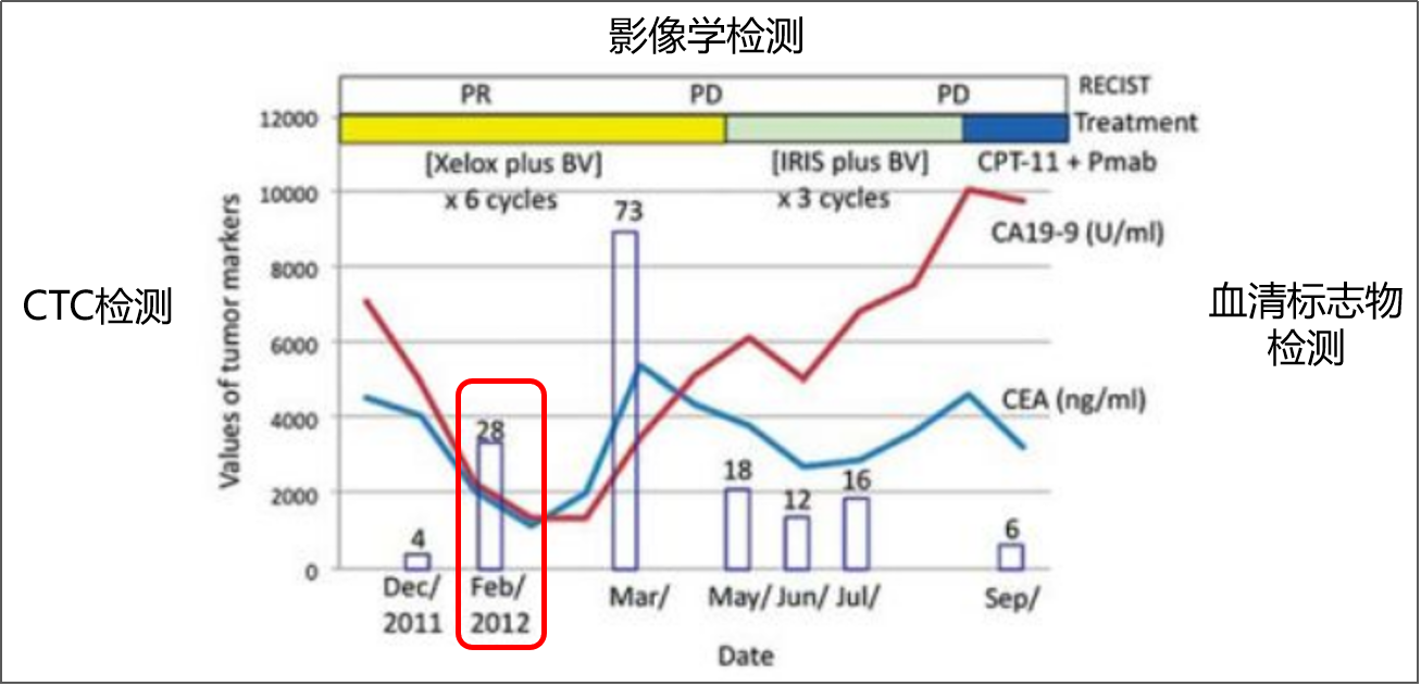 腫瘤治療過程CTC、血清標(biāo)志物及影像學(xué)檢測結(jié)果[1]