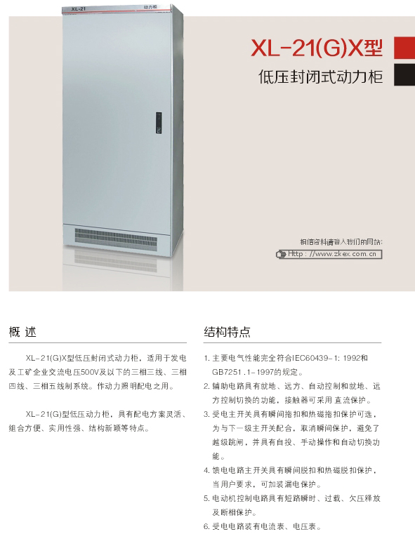 XL- 21(G)X型低壓封閉式動(dòng)力柜,適用于發(fā)電 及工礦企業(yè)交流電壓500V及以下的三相三線、三相 四線、三相五線制系統(tǒng)。作動(dòng)力照明配電之用。 XL-21(G)型低壓動(dòng)力柜,具有配電方案靈活、 組合方便、實(shí)用性強(qiáng)、結(jié)構(gòu)新穎等特點(diǎn)。
