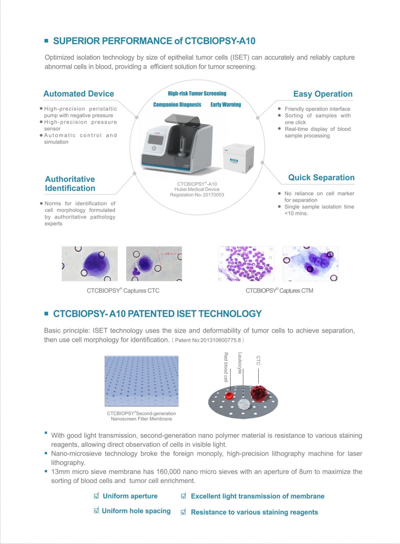Recently, self-developed 4 CTCBIOPSY® products obtained CE certificates.CTCBIOPSY is an automated circulating tumor cell (CTC) separator instrument, through the use of polymer materials made of microporous filtration device, based on the CTCs size, deformation capacity, fluid mechanics and other physical characteristics of differences. The circulating tumor cells in peripheral blood can be separated and enriched from blood cells quickly and accurately. The cell morphology of CTC and CTM can be observed under ordinary optical microscope by combining with Wright-Giemsa staining kit.